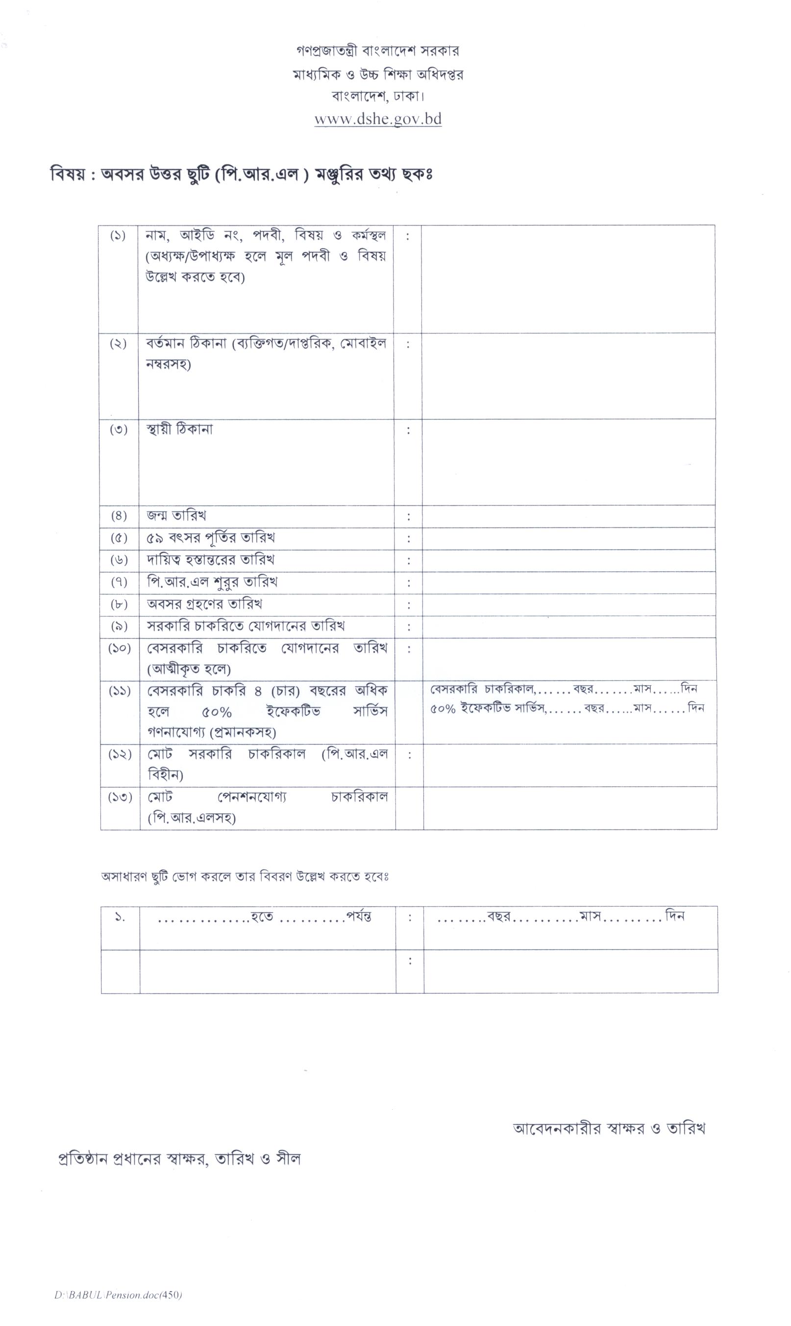 অবসর উত্তর ছুটি (পি.আর.এল) মঞ্জুরির তথ্য ছক