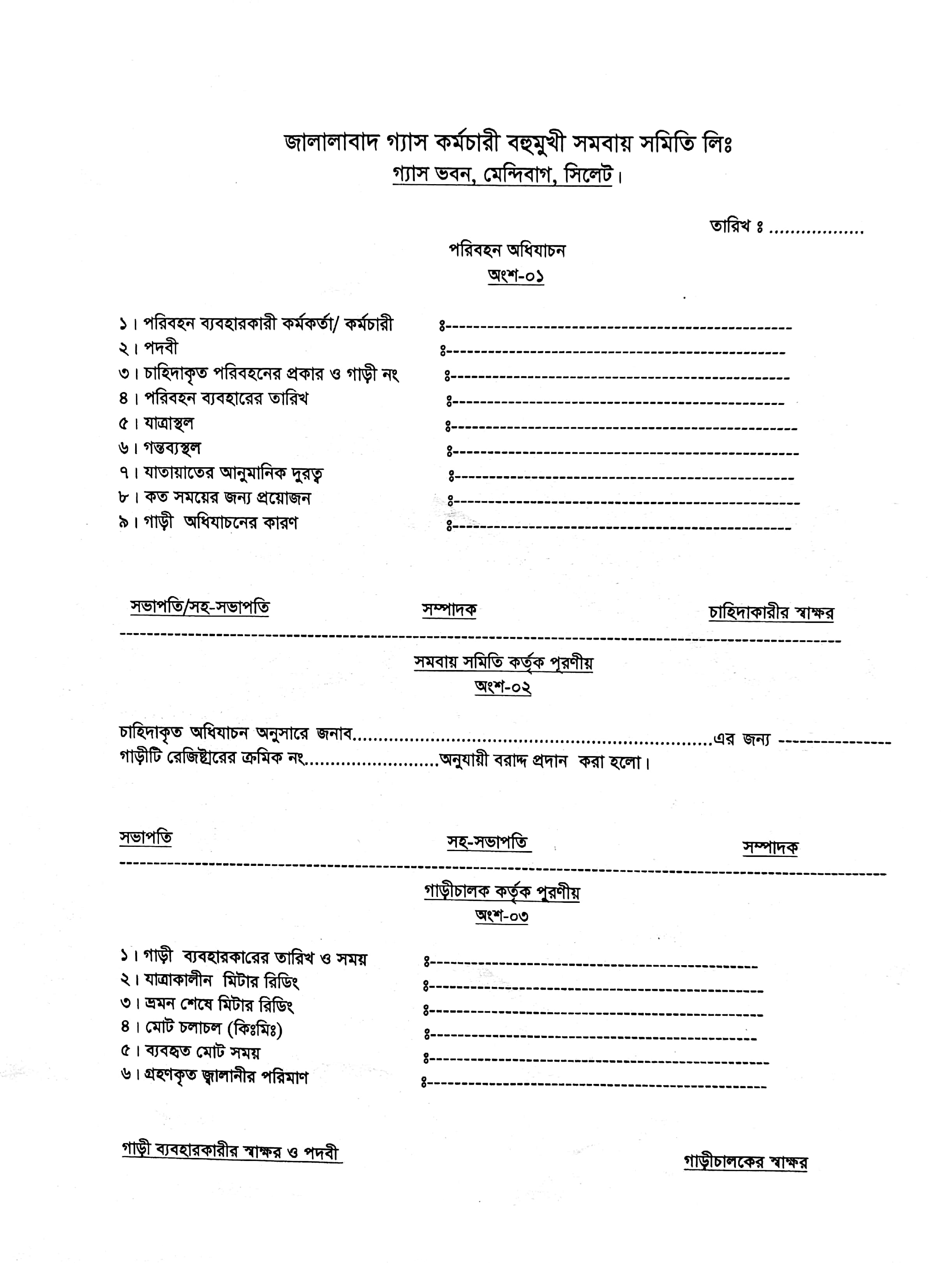 সমিতির গাড়ী অধিযাচন ফরম
