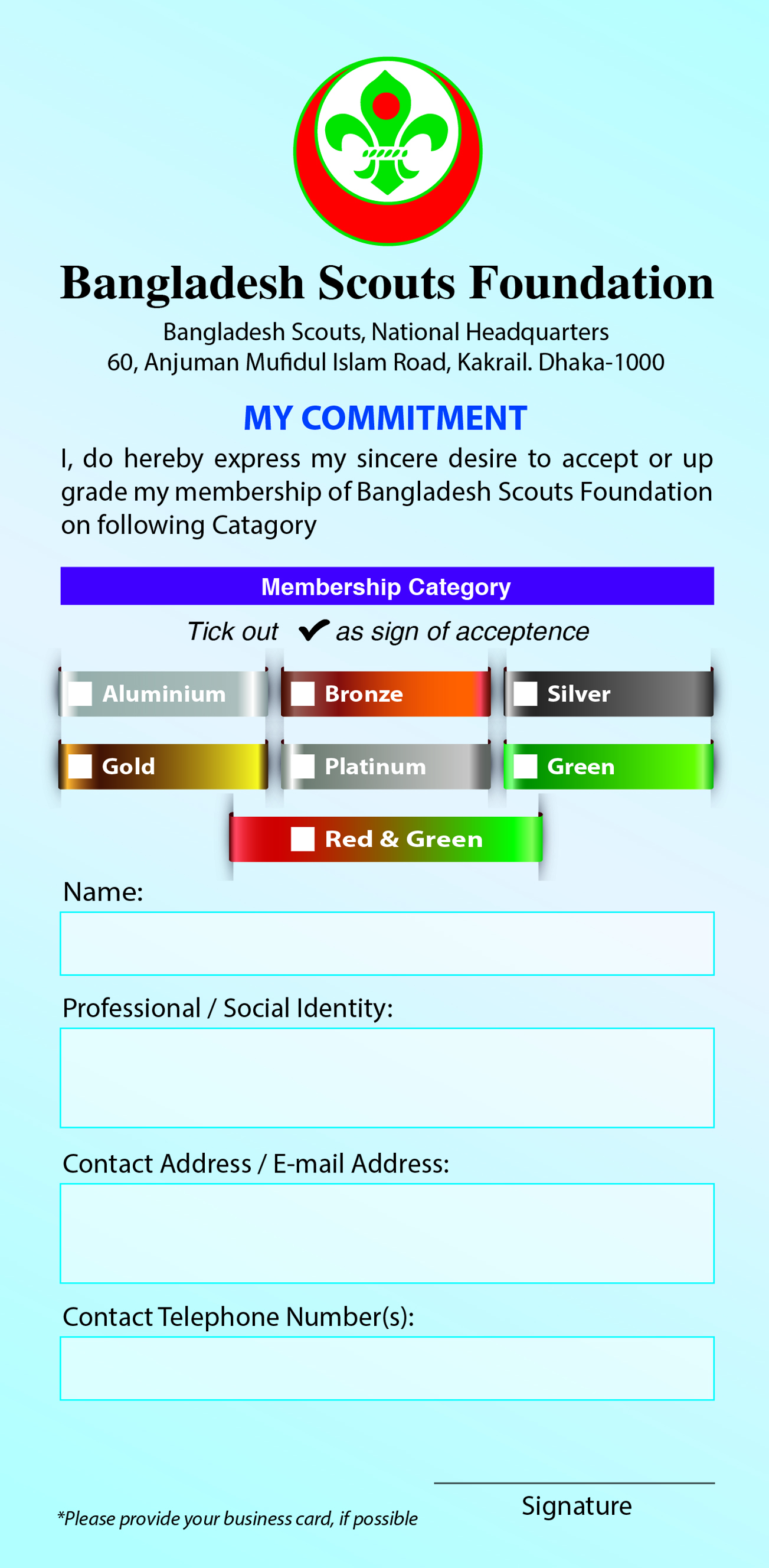বাংলাদেশ স্কাউটস, ফাউন্ডেশন এর কমিটমেন্ট ফরম
